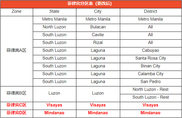 Shopee平台菲律宾站点Standard International渠道将于2021年3月31日起调整菲律宾站点分区。原菲律宾C区 (Visayas & Mindanao)将 拆分为菲律宾C区 (Visayas) 和菲律宾D区 (Mindanao)。