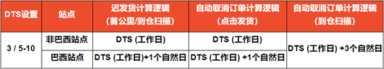 4月4日生成的非巴西站点订单,DTS设为3天,4月8日前被首公里成功扫描或到仓扫描即可。