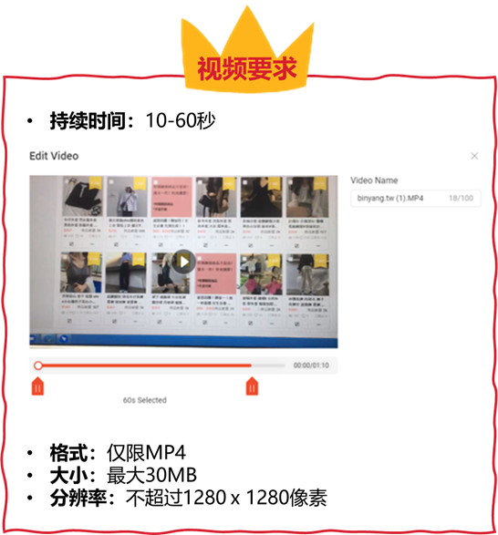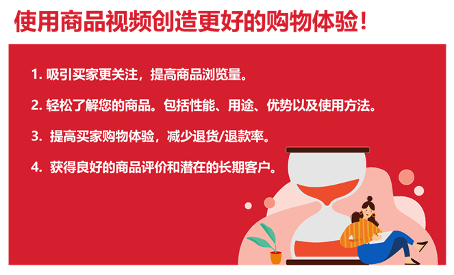 2. 控制时长:简短明了,最好在60秒内。一段优质的视频可以告诉短时间内让买家了解您的商品。