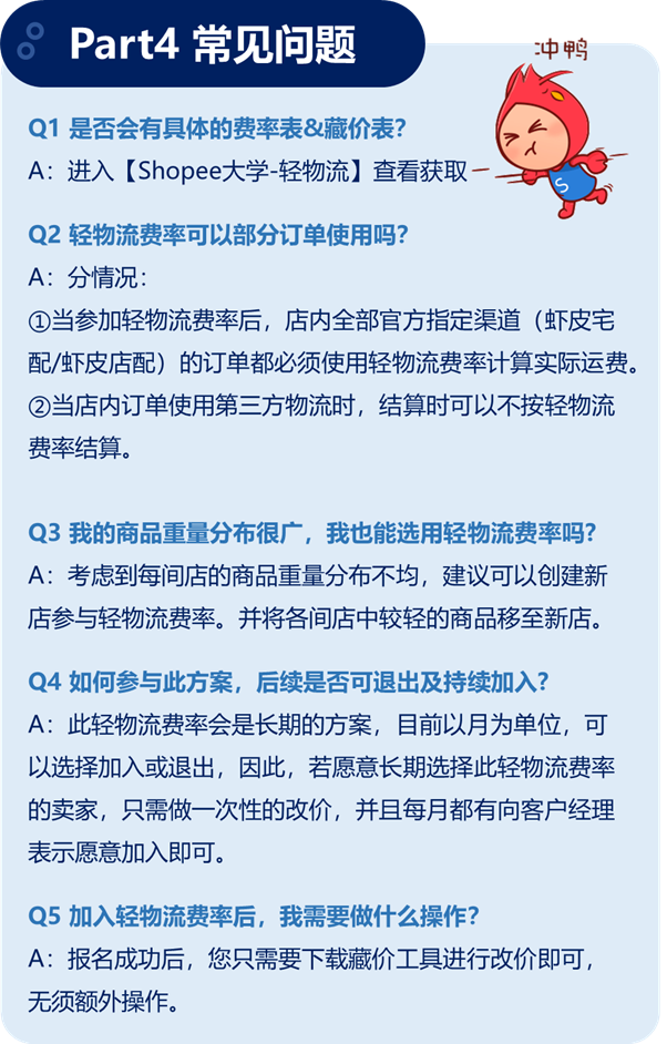 关于轻物流的更多常见问题与详细信息,请进登录【Shopee大学>>轻物流费率】查看~