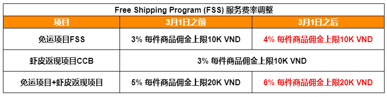 ①参加FSS免运项目的服务费费率将从3%调整到4%,每件商品佣金上限10K VND不变