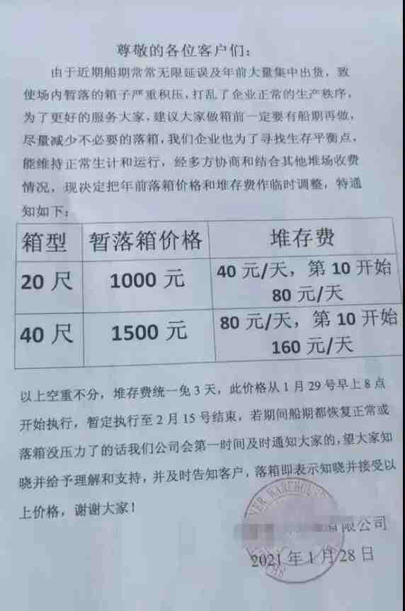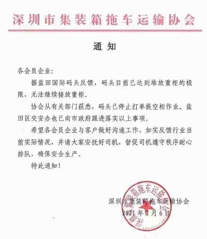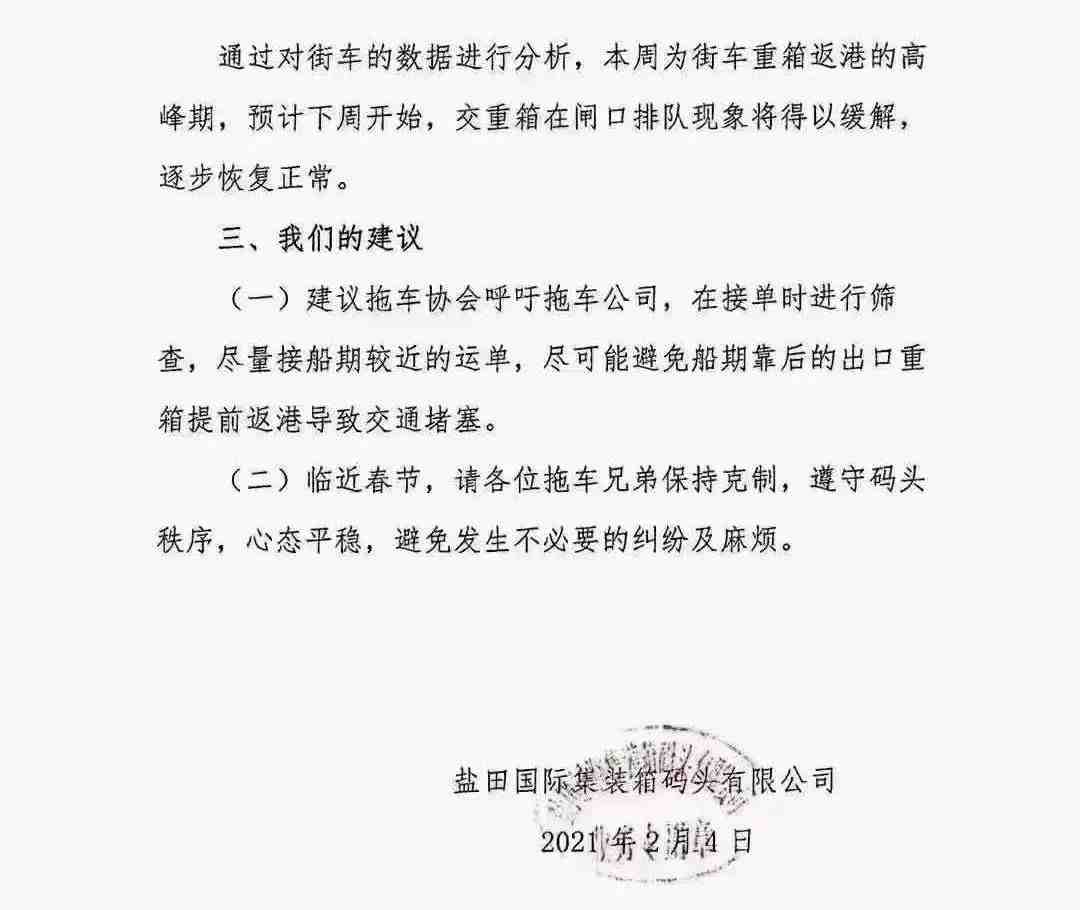 2021年2月4日,盐田国际发布了《节前码头操作及港外交通的情况通报》,通报称,当前盐田码头已达到堆放重柜的极限,提柜也变得非常缓慢,只能将码头内的部分空柜、进口重柜转至码头外堆放,最大限度释放出口重柜堆存能力。