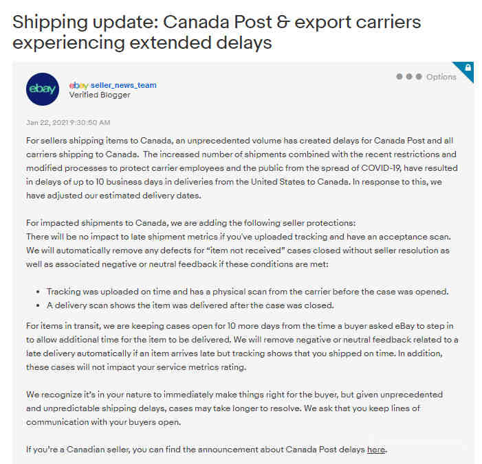 另外,加拿大邮政日前也发布了关于物流延迟的紧急通知。为此,eBay提醒卖家: