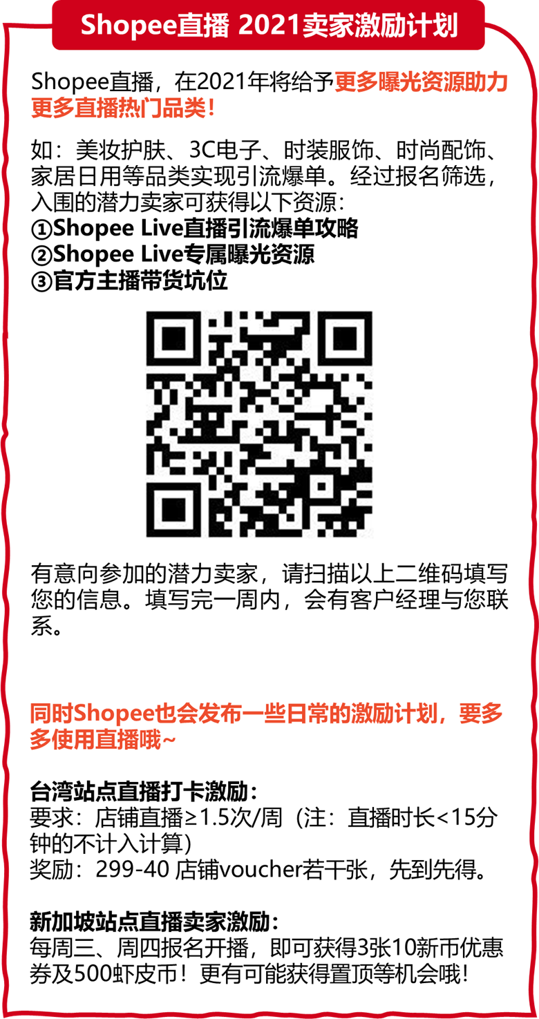 另外,Shopee还为您带来了2021直播卖家激励计划,入围卖家将有机会获得Shopee官方直播引流攻略及平台专属直播曝光资源!您心动了吗?