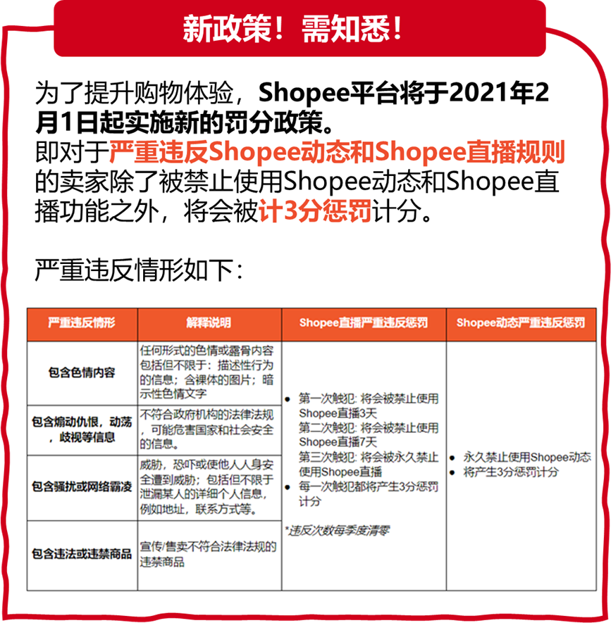 最后,为了给您和买家创造一个更好的购物环境,Shopee直播及Shopee动态开始实施最新罚分政策,一定一定要注意哦!