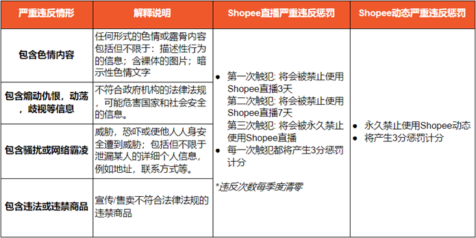 为了提升买家在使用Shopee动态和Shopee直播时的购物体验,Shopee平台将于2021年2月1日起实施新的罚分政策。即对于严重违反Shopee动态和Shopee直播规则的卖家除了被禁止使用Shopee动态和Shopee直播功能之外,将会被计3分惩罚计分。