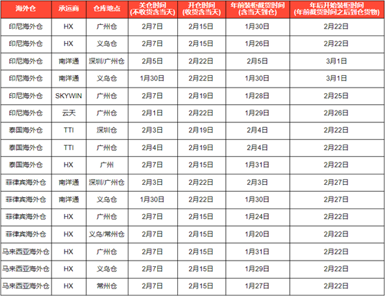 1.节前最后一批运输货物不保证节前能全部派送,需要节前完成派送的请尽早发货到仓;年后开始装柜为计划时间,如果货量充足可能会提前安排。