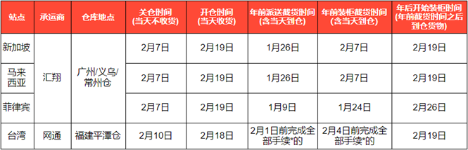 注:巴西/泰国/台湾站点春节期间到仓货物时效预计延误4-6天左右;其余站点时效预计延误3-4天左右。