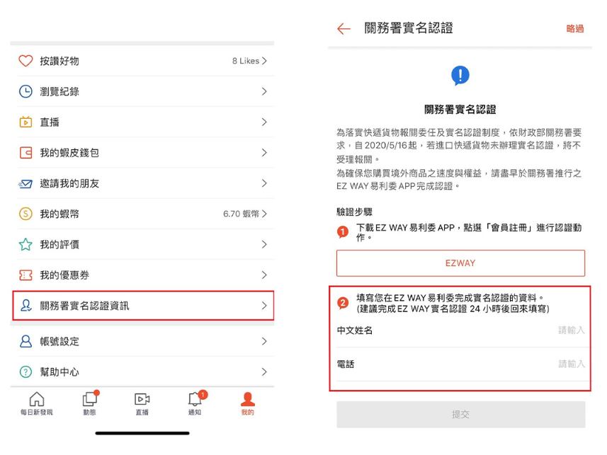 为了更好的提高台湾站点大件物流渠道服务体验,避免因买家资质审核 (KYC)问题导致订单取消,于2021年1月15日起台湾站点大件物流渠道启用买家实名下单模式:买家只有在「EZ WAY 易利委」App上完成实名认证,且在虾皮个人资料中【關務署實名認證】里填写的实名信息核验通过后,才可以选择“宅配大件”物流渠道下单。