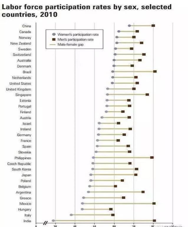 也许会有人说,为何曾经为东印度公司的印度人口更多,反而不能与中国形成制造业竞争优势,历史政治等诸多因素不多说,但从数据角度看,劳动密集型,在“天道酬勤”是最佳的解释,中国印度的男人都90%参与工作,而印度女人只有30%不到(全球最低),中国女人们却高达70%(全球最高),这工作比例也看得出我国在男女平等,工作机会平等,其实已经处于世界水平。