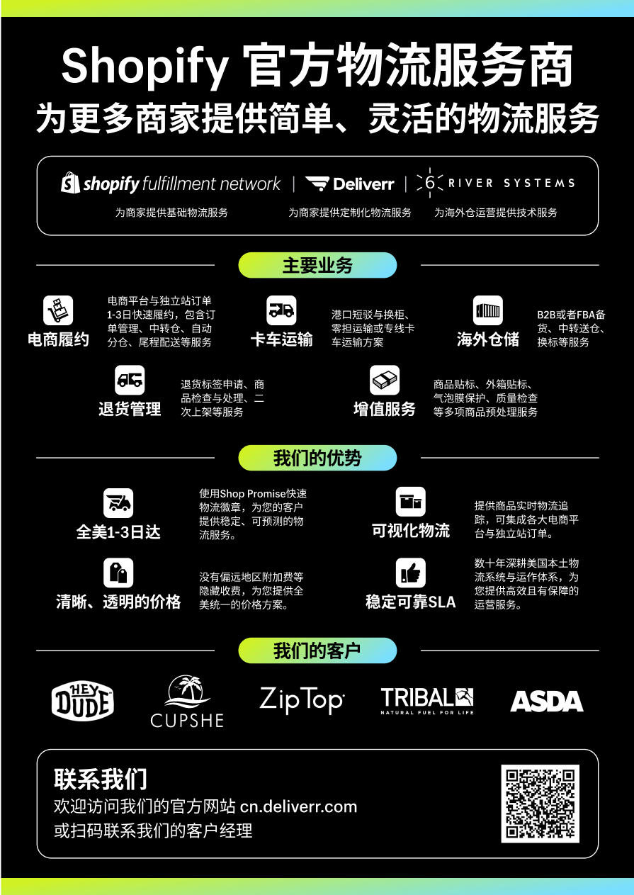 Logistics by Shopify是独立站建站工具Shopify最新推出的官方物流服务,包含Shopify Fulfillment Network提供的简单物流服务、Deliverr提供的定制化物流服务与 6 River Systems提供的海外仓技术运营运营服务。通过遍布全美的30+仓库,以及与DHL、FedEx等9家运输公司的合作,Logistics by Shopify 帮助跨境商家实现全美1-3日快速达,解决多种跨境物流需求。Logistics by Shopify 相信销售额增长来源于快速、稳定的尾程配送。通过推出Shop Promise快速徽章,为消费者提供稳定、可预测的物流服务,Logistics by Shopify 帮助商家降低广告点击成本、提升产品转化率和提高复购率来降低物流成本,让商家将更多精力集中于自身业务增长。Logistics by Shopify 提供的跨境物流解决方案包含:- 电商履约:电商平台与独立站订单1-3日快速履约,包含订单管理、中转仓、自动分仓、尾程配送等服务。- 卡车派送:港口短驳与换柜、零单运输或专线卡车运输方案。- 卫星仓:B2B或FBA备货、中转送仓、换标等服务。- 尾程配送:协助拥有自有仓商家进行尾程派送,包括商品分拣和订单管理。- 增值服务:退货管理和商品预处理服务,预处理包括贴标、质量检测、二次包装等服务。Logistics by Shopify 致力于成为与商家业务共同成长的物流服务商。