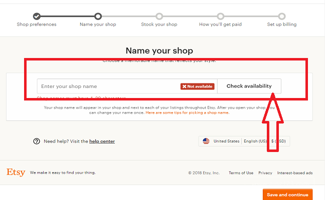 3、设置Etsy店铺名称:设置一个能体现卖家风格、令人印象深刻的名称。店铺名称必须符合以下要求: