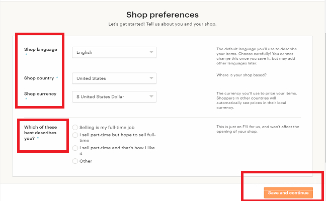 2、设置Etsy店铺信息,选择店铺语言、所在国家和币种,点击保存继续。