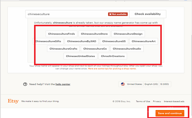 如果卖家输入的商店名称已经被占用,系统会给出其他建议的商店名称。卖家可以选择其中的一个名称,也可以重新写一个新的名称。