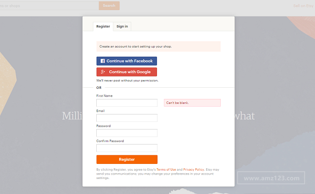 1、Etsy账号注册,在首页右上方点击“sell on Etsy”链接。注册Etsy卖家账号: