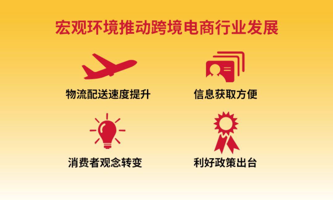 中国作为制造大国,出口一直是重要的经济推动力。跨境出口电子商务源于跨境贸易,早期跨境贸易的模式大多是线下交易。而随着互联网的普及,大量电子商务相关业务及网络公司出现,跨境电商也由此诞生并迅速成长。近几年,随着物流配送便捷度和速度逐渐提升、信息获取和交流越来越方便、人们消费观念的不断转变和各项利好政策的出台,目前中国及世界整体宏观环境均在推动着跨境电商行业正向发展。