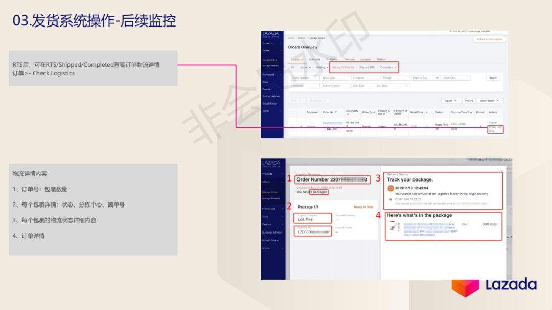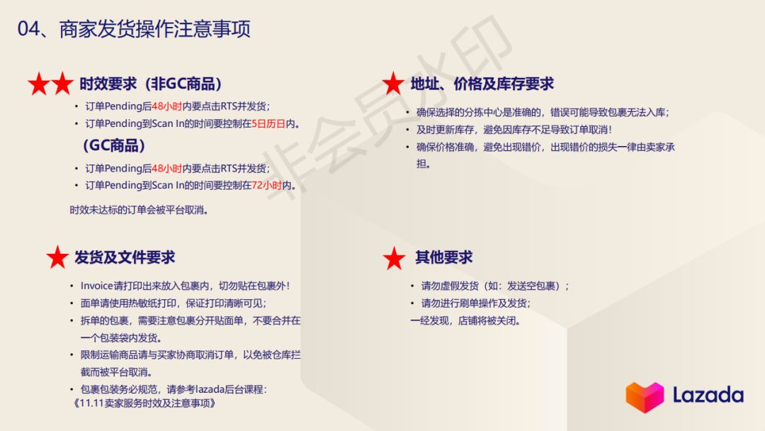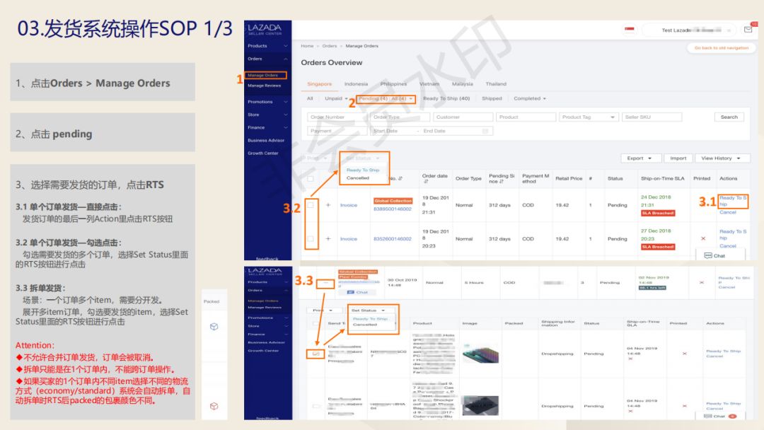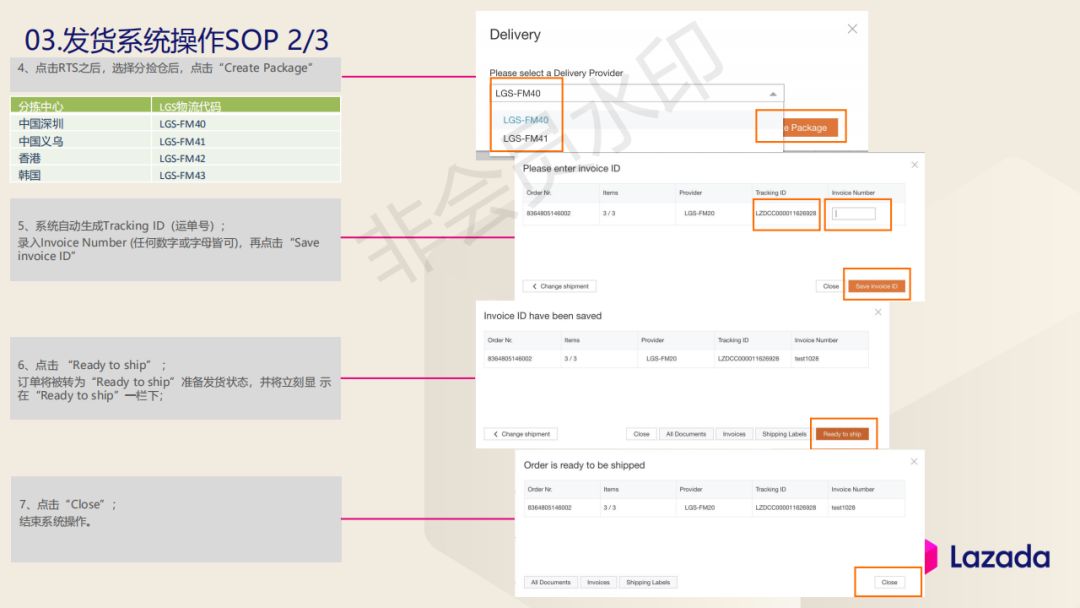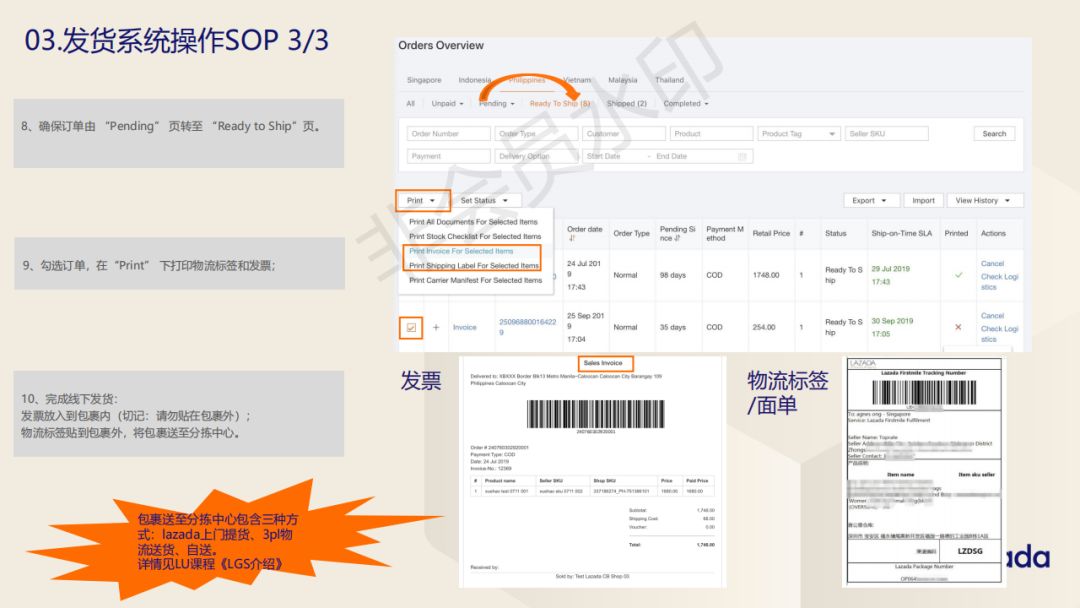 如何处理订单 由于信息不完全对称,不少小伙伴并不能得到全部的培训资料或者介绍全方位的培训,在此情况下,自然会有很多问题摆在新入行的卖家面前。比如下面这个:我今天店铺开单了,需要怎么打印订单发货呢? 接下来,就一起来看一看吧 注意事项 “义乌或者深圳仓库,记得不要弄错了哦” 打印出订单和发票 更新完状态为RTS 还要记得 按照订单选择的分拣中心代码将快递送达或寄到lazada在义乌或者深圳的分拣中心哦 对了 记得要好好打包哦 毕竟漂洋过海的 还有什么不明白的,欢迎私信我