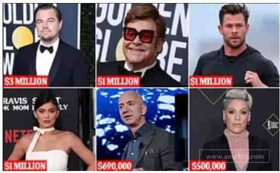 卡戴珊家族的凯莉 · 詹娜捐了 100 万美元,美国笑星贝特 · 迈德尔捐了50 万美元,她的身家仅几亿美元,不够贝索斯的零头 ……