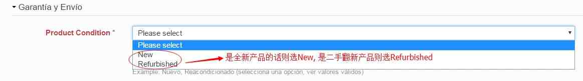 注意:如果卖二手翻新产品, 单个上传 SKU 时只允许在 Product Condition 处出现 Refurbished 字眼. SKU 其余任何地方禁止出现 Refurbished 和 Reacondicionado 字眼,否则 SKU 会被下架。