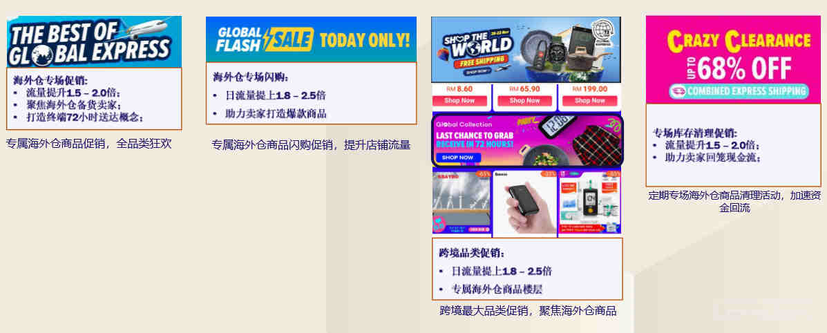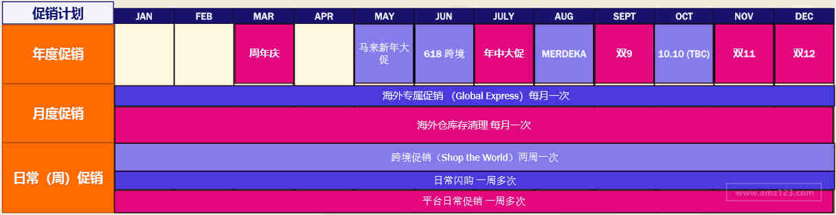 年度大促:周年庆、年中庆、双9、双11、双12 A级促销:马来新年大促、618跨境促销、MERDEKA,10.10 海外仓专属日常促销:Global Express、Shop the world、海外仓闪购