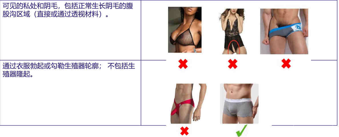 • 带有性取向的图片和裸露内容(这是指生殖器和女性乳房的 任何视觉表示,但母乳喂养除外)