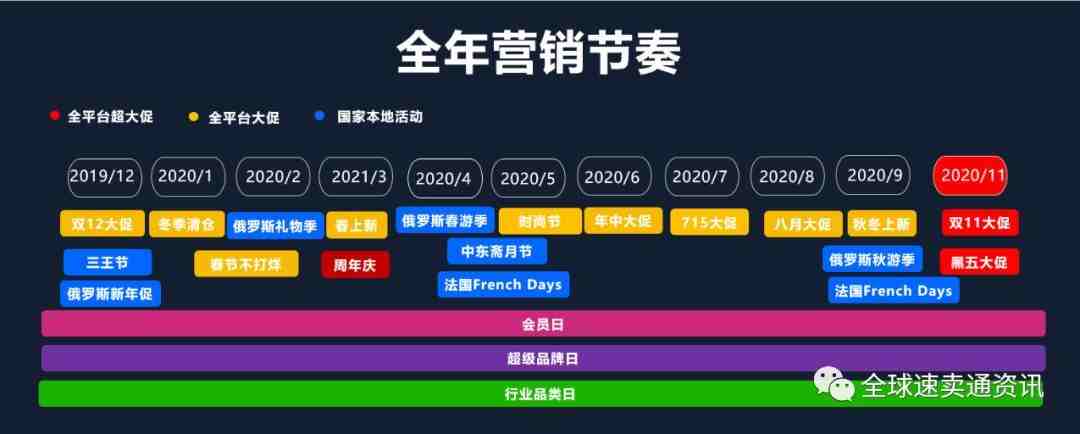 速卖通2020年营销的四大关键词为"内容化、时尚化、本地化、品牌化",明年整条营销路线除了体育营销以外,1月份春节不打烊,4月底法国french days活动,5月份夏季的活动紧接着6月份的年中大促,下半年即是双11和“黑五”,2020年每一个月份至少有一场营销活动,速卖通都会分节奏按照国家差异组织相关营销活动。