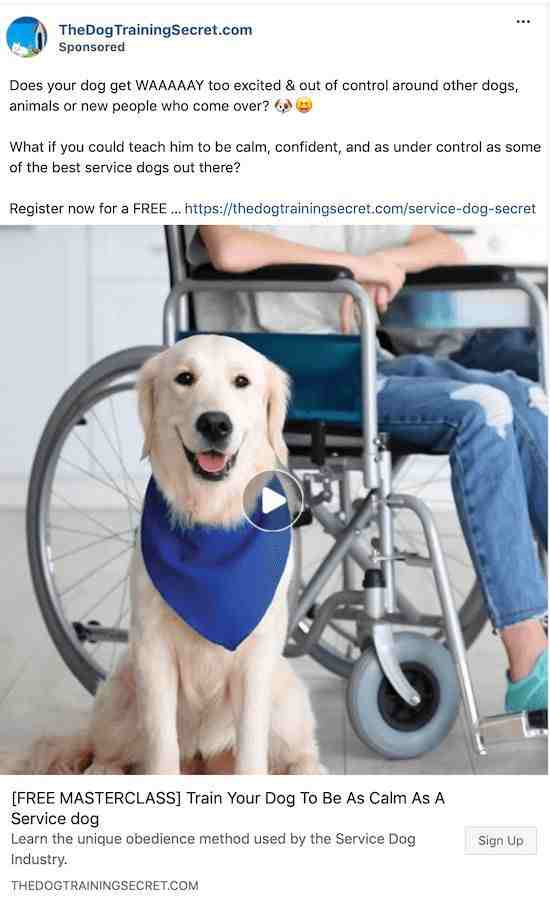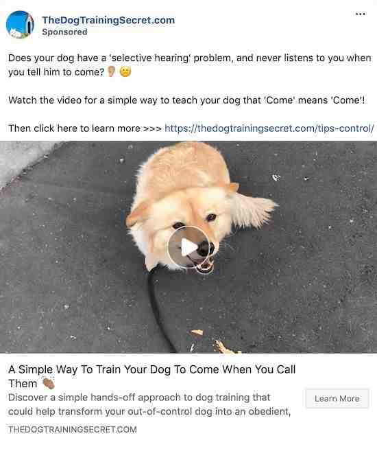 举个例子,一家名为Dog Training Secrets的公司,销售狗狗训练视频课程。他们的广告上写着:“当您的狗狗看到自己想要的东西时,会不会变得过于兴奋、失去失控?观看此视频,您将学会一个小窍门,教会您的狗狗听从指令冷静下来,点击此处以了解更多信息。”