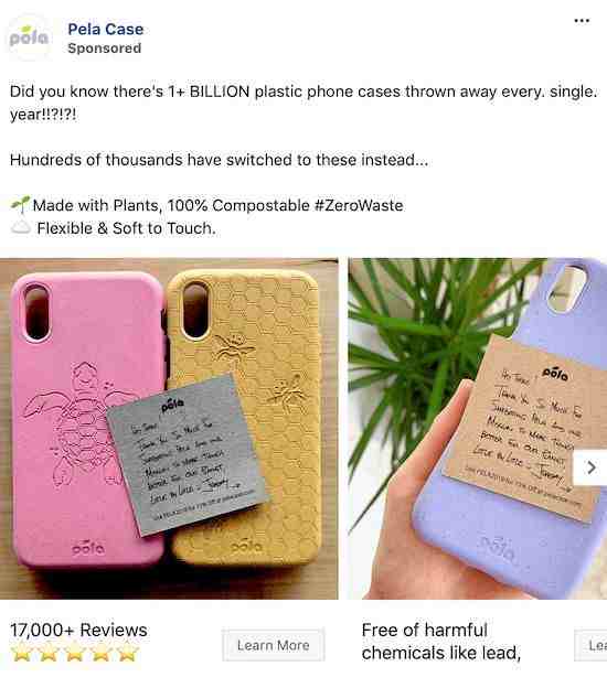 在广告文案中找到能证明你观点的逻辑陈述或事实,那些逻辑性强的人就会马上同意你的观点,并想要继续了解下去。一家将塑料水瓶变成艺术品的公司投放了这样一则广告,它以一个逻辑性的陈述开头,帮助人们理解如果这些塑料都在海洋中那会是一个多大的问题。广告开头说:“ 巨大的太平洋‘垃圾带’,聚集了来自夏威夷和加利福尼亚之间的塑料漂浮垃圾,面积已经增长到60万平方英里以上”,并引用《USA Today》作为消息来源,之后进行了产品的行动号召以及说明为什么他们创造了这个产品。以这样一个令人震惊的统计开头同样可以引起社会认同,人们会希望与世界上的其他人分享这些信息。再比如,Pela Case,生产一种30天就能分解的手机外壳。对于这个品牌,最适合他们的文案是,“你知道每年有10亿个塑料手机壳被扔进垃圾填埋场吗?”使用逻辑挂钩的前提是,需要提供一些毫无争议且真实的数据来引起读者注意,但不一定总是数据或数字,也可以是纯粹的教育。例如,有一个利用荷尔蒙帮助女性平衡膳食的品牌,它的广告可以以“您是否知道您的荷尔蒙每周都在变化,而您的饮食应该与之匹配?”开始。大多数人不知道这一点,所以才会被它吸引。为每个广告系列选择多个挂钩,而不仅仅依靠一个挂钩。因为即使你的受众具有某些共同点,他们也是不同的人,或者经历不同。有些人今天可能是情绪化的,会对基于感觉的广告文案做出回应;有些人更可能对有逻辑的广告文案做出回应;有些人也许刚好遇到了你在广告文案中提到的痛点。建议每个广告系列中至少包含两个挂钩,这样就可以根据客户的情绪状况和经历,吸引尽可能多的人。