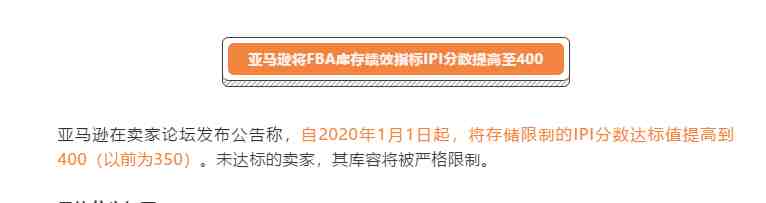 三、关于亚马逊FBA库容的IPI指标新规将于2020年1月1日开始实行,IPI指标分数从原来的350分被提至400分,未达标的卖家,库容会被限制,如果超容,还会被收取超容费。