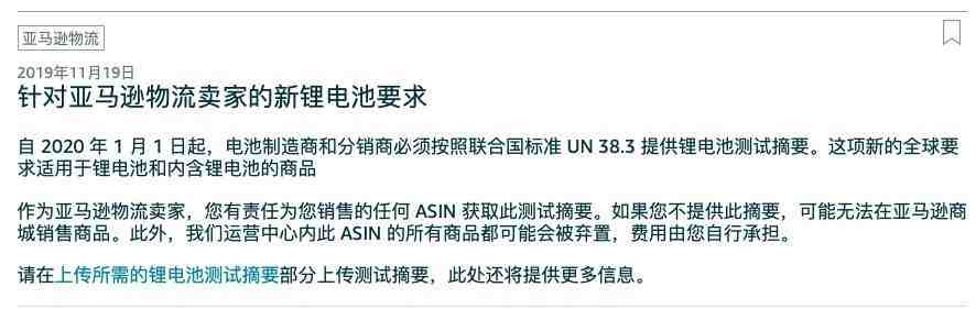 二、销售锂电池以及内含锂电池的卖家迎来新规定,按照亚马逊的要求,自2020年1月1日起,相关卖家必须提交符合UN38.3规定的锂电池测试摘要。