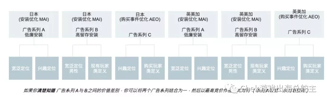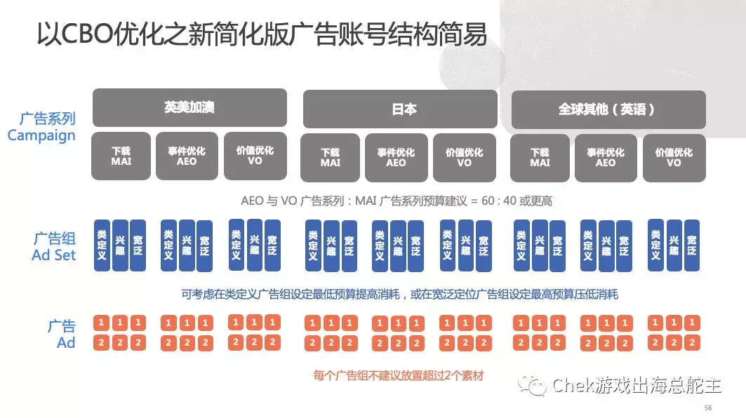 不少小伙伴们纷纷表示,学习CBO使他们快乐,学习CBO让他们上头,学习CBO一期实在不够!于是今天准备了CBO手把手教学指南,结合常见问题分析,搭配神级广告架构,力求助你全方位把握这款爆款营销工具! Q 在一个广告系列中有采用不同优化目标的广告组(如移动应用安装优化,应用事件优化和价值优化),应如何使用CBO? A 根据不同的优化策略创建不同的广告系列,如下图所示,广告系列A是针对安装优化,广告系列B是针对购买优化,广告系列C则针对购买价值进行优化,下面再分别包含适合这些优化目标的广告组。 Q 我同时在多个国家投放着广告,应如何使用CBO呢? A 根据优化目标或相似的预估用户终身价值(pLTV)来对国家进行分组,然后把它们划分到不同的广告系列中。如下图所示,广告系列A是针对主要市场,广告系列B是针对以获取下载量为目标的市场,而广告系列C则是针对第二层级的主要市场。 Q 我有很多广告组,它们的的受众群组和受众规模都不相同,应如何运用CBO呢? A 根据优化策略/目标划分受众,然后把它们划分到不同的广告系列中去。如下图所示,广告系列A是追求成本低的安装,广告系列B是追求更有可能留存下来的安装,广告系列C则是追求会进行购买的安装,每个广告系列下面都对应着拥有相同或类似优化策略/目标的受众定位。 Q 目前的广告系列虽然让我觉得有潜力,但获得的转化次数并不足够? A 虽然在使用CBO时,系统会自动把预算分配到成效最佳的广告组,但同时你也可以通过为部分广告组设置花费下限或上限,进一步控制这些广告组获得的预算。我们建议当你在追求除单次最低成效费用以外的其他目标时,可以采取这些操作。 如下图所示,你可以为你觉得有潜力的广告组设置花费下限,这样便可保证该广告组一定能够获得展示,然后再检视其成效。 以CBO优化的新简化版广告账号结构 打造简化、规模化的广告帐户结构,能够给予系统足够的灵活性通过机器学习自动优化,省心省力,成效还更为出众,使用CBO时也不例外。大家可以参考以下指引简化广告账号结构,并结合CBO最大化营销成效。 不同的市场+不同的优化目标 —— 创建多个广告系列 建议使用AEO 与 VO 广告系列的预算与使用MAI 广告系列的预算比例为 60 : 40 ,或更高 不同的定位 —— 创建不同的广告组 可考虑在定义受众的广告组设定最低预算,提高消耗;或在宽泛定位的广告组设定最高预算,压低消耗 不同的广告 每个广告组不建议放置超过2个素材 这就是整个广告账号经过简化之后的大致结构,有广告主使用这种结构,成功在200个国家和市场定位目标受众,获得了稳定的投放成效。我们建议确保每个广告组的受众规模都大于100万,这样能够延迟受众对广告素材感到厌倦的时间,并降低广告更新频率,有利于结合CBO实现更稳定的投放,成效也更容易预测。