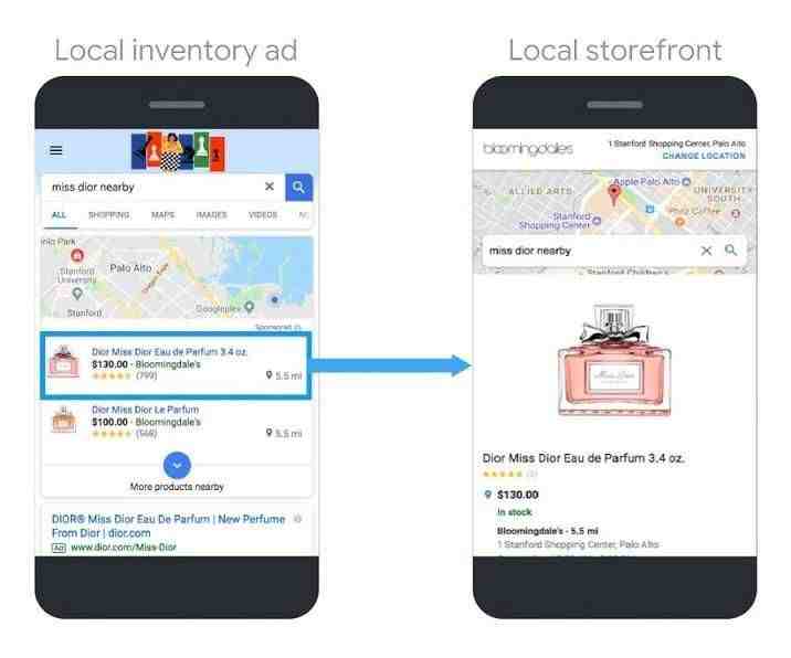 为了帮助卖家把这种趋势转化为额外的收入,谷歌创建了本地库存广告。例如,当一个潜在顾客搜索“women’s perfume near me”时,他们会看到一系列当地的库存广告,每一个都提供了图片、价格、店内库存,以及具体位置。
