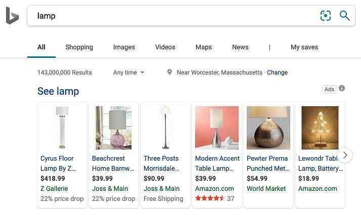相当于谷歌购物广告,微软产品广告是基于图片的促销活动,位于搜索结果页面的顶部。产品广告是为了吸引想要购买产品的用户而设计的,它包括图片、标题、价格和品牌名称。如果你很精明,产品广告也可以加入一个特殊的优惠,这将进一步把你和你的竞争对手区分开来。