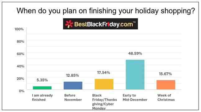 这个数据来自来自致力于所有商品零售的在线广告商Best Black Friday。根据他们对1000多名美国成年人的调查,大约16%的消费者会在圣诞节那一周完成节日购物。