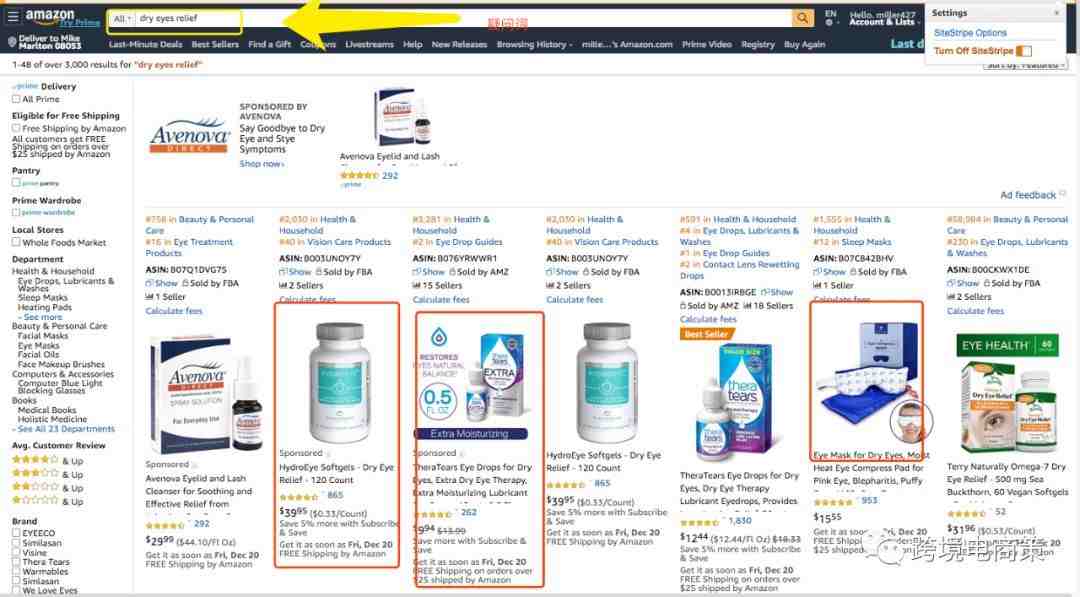 购买词:购买词和核心关键词是有区别的,我在实操视频中也专门提到过这个问题,所以我的建议一定要看实操视频,比如说举个例子,dry eye relief mask 【缓解双目干涩眼罩】,搜索这个词的消费者已经知道自己要买 mask ,还是药膏,还是眼药水,已经非常确定,所以这个时候这类词的转化远远超过上面的疑问词 ,请看下图