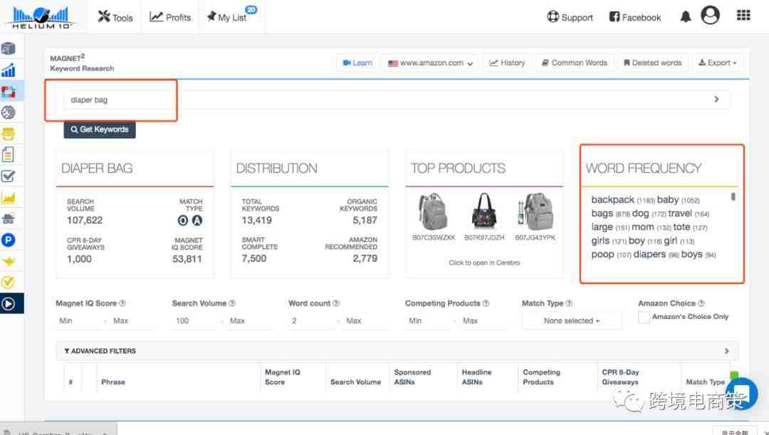 第三步:搜索量最大的和我们产品的核心diaper bag 放在 magnet 里面做一次检测