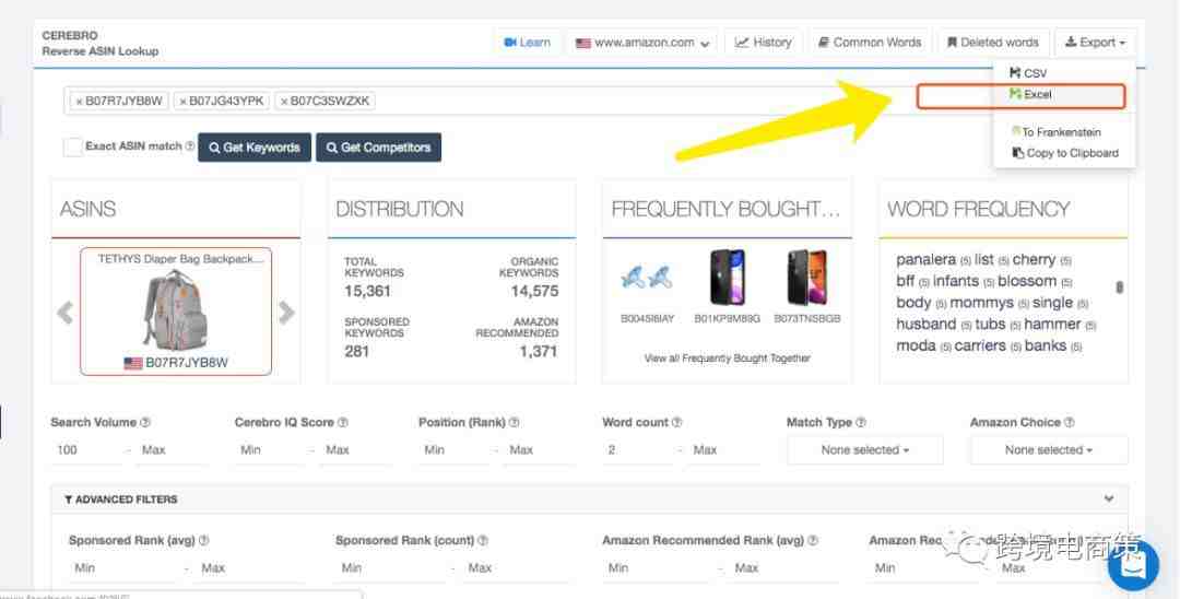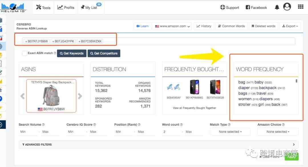 第二步:在选择4-5个排名靠前的放在helium10的cerebro 里面看看关键词,这次我们要看的是word frequency 这里,要一个个的过 。