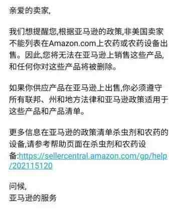 举个例子大家能够理解更深刻一些,比如最近农药与相关产品被亚马逊下架、中国卖家频遭“误杀”的消息传得沸沸扬扬,很多卖家收到了这样一封邮件: