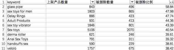 但是利用大数据,就能轻易知道得到近一年被删几率高的关键词,像下图这些被删比例达30%-50%风险系数极高的产品,我们在选品阶段就可以避开这些坑了。