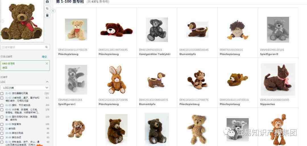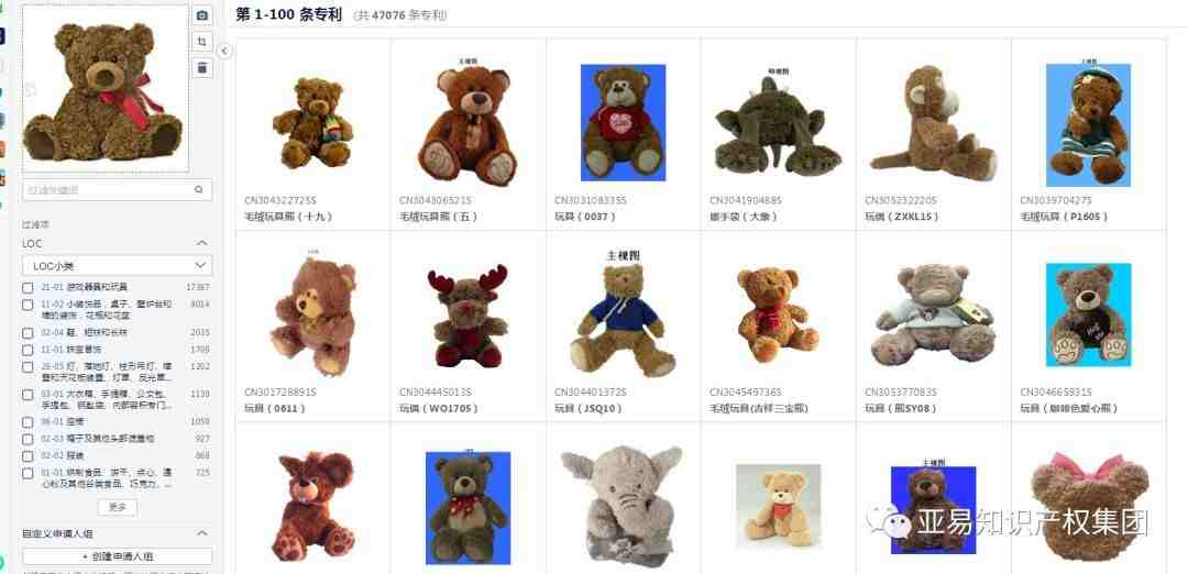 以上出现在亚马逊最受欢迎毛绒玩具的排行版中,但是值得高兴的是,我们并没有检索出与其“一模一样”的外观专利。但是通过“毛绒熊”进行检索,仍可以搜索出大量专利产品,如下图: