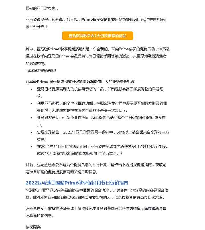 关于这个全新的亚马逊prime 秋季促销,我们来划一下重点: 【亚马逊Prime秋季促销活动】是一个全新、面向Prime会员的促销活动。 活动的基本形式其实和Prime Day差不多,优惠力度和节日促销季是同等级的。 卖家们表示欧洲站、美国站都收到这个促销信息,猜测应该是10月份开始。 7月22日前都可以提报秋季促销活动,9月12日前入仓即可。