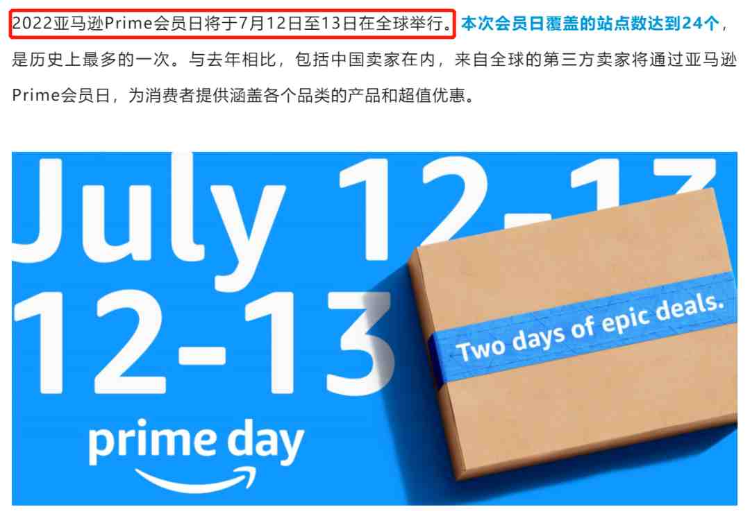 亚马逊官方宣布,一年一度的Prime Day会员日活动将于美国东部时间7月12日在凌晨3点开始,一直延续48小时。给大家划一下重点: 本次会员日覆盖的站点数达到24个,是历史上最多的一次。(包括澳大利亚、加拿大、中国、法国、德国、意大利、日本、墨西哥、荷兰、新加坡、英国、美国等共计24个站点。) 对中国卖家开放的瑞典站、波兰站首次参加亚马逊Prime会员日。 印度、沙特阿拉伯、阿联酋和埃及站点的亚马逊Prime会员日将在今年夏天晚些时候举办。
