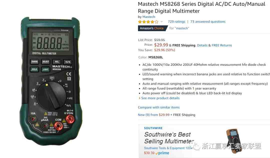 华仪仪表是中国电子测量工具的主要制造商之一,产品包括电力电工测试、数字多用表、数字钳形表、红外测温、环境测试、电阻测试等。华仪仪表旗下的Mastech品牌很早就有在亚马逊上销售,比方说这款万用表,2006年就已经登陆亚马逊。