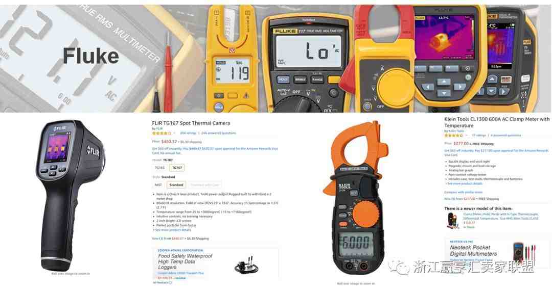 测量仪器的产品包括有网络测试仪器、工业测试仪器、 医疗测试仪器、精密测试仪器、以及温度测试仪器等,目前在亚马逊上在售的比较畅销的品牌有Fluke、Flir、Klein Tools、Innova、Ridge、Extech、Testo、Rohde & Schwarz等等。这些畅销品牌都有着品牌实力强、产品定价高、页面高端专业、同时在线上线下都具有高知名度等相同特点。