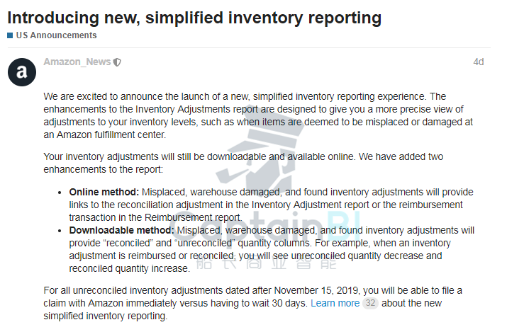 船长BI获悉,近日,亚马逊发布了一则公告宣布,将对库存报告进行调整,推出全新的简化库存报告体验,同时新添加了两个增强功能,旨在为卖家提供更精确的库存水平调整视图。例如在亚马逊物流中心,将物品视为放错位置或损坏的情况。 (图源亚马逊论坛) 以下是盘库报告新增的两个增强功能 1、在线报告 错放,当调整盘库时,将提供盘库报告中的调整盘点或赔偿报告中的赔偿交易的链接。 2、可下载的报告 错位,你将能够看到【误放库存】、【找到库存】和【在亚马逊物流中心残损】的【已调整】和【未调整】数量列。例如,当盘库获得赔偿或调整后,你将看到未调整数量减少而调整数量增加。 此外,对于2019年11月15日之后所有未调整的【剩余的误放或残损库存】,卖家可以立即向亚马逊提出索赔,而不必等待30天。 船长BI了解到,此次的库存报告进行简化调整,报告显示了库存的历史记录,其中包括库存属性更改、错位、已找到的库存和所有权更正等问题。主要是给卖家提供更精确的库存信息,哪里缺货,库存不足的可以补货,也同样简化了库存损毁时,申请理赔的繁琐过程。 你可以在卖家平台在线查看库存盘点,或通过下载盘库报告进行查看。 建议使用【Online View】即在线视图查看方法,以便快速查看盘库和调整。当盘库被调整时,将提供盘库报告中的调整盘点或赔偿报告中的赔偿交易的链接。 以下是在线视图的示例: (图源亚马逊) 同时,在在线视图中,你可以按【Cause Group】即原因组筛选盘库,如下表所示。 按库存代码列出的原因组: (图源亚马逊) 建议使用【Download】即下载方法,以便大规模了解盘库的调整状态。 以下是下载视图的示例: (图源亚马逊) 船长BI提醒: 如果盘库超过 50 个,报告将生成多个页面,使用报告顶部和右下角的快速链接在页面之间导航。 不过话说回来,关于“索赔”的问题,大部分FBA卖家都会经历到。一般来说,卖家要碰到比如丢件、漏件,或是损坏等问题,如果符合索赔政策的要求,需要自己主动去发起索赔。亚马逊不会主动“承认错误” ,只有当亚马逊收到卖家的索赔邮件,才会去核对、寻找所索赔的商品,启动索赔流程,或者将丢失的商品找回、将放错位置的商品归到原处等。 这时候,船长BI的FBA索赔就可以帮助到卖家,自动为卖家所授权店铺分析可索赔商品及明细,生成完整版索赔报告,而卖家只需要复制到亚马逊后台开case即可。 (点击查看大图) 哪些商品符合索赔政策要求? 在亚马逊物流中心残损的商品 在亚马逊物流中心丢失 30 天的商品 在受亚马逊委托为买家配送商品的承运人或经销商处丢失或残损的商品 在亚马逊合作承运人(小包裹、汽运零担和整车运输)向亚马逊物流中心运输途中丢失或残损的商品 除了常见的损坏丢失,以下因亚马逊导致的情况也可索赔的范围内: 亚马逊“高估”货物的重量和尺寸 亚马逊退还给买家的金额超过实际支付,致使卖家承担多出的费用 亚马逊在退换货时,只换未退 亚马逊申明已经退货/退款,但实际并未退货/退款 订单逾期30天,退款要求仍未处理4 …… 哪些商品不符合索赔政策要求? 亚马逊物流禁运商品 不符合亚马逊物流库存要求的商品 在移除订单处理过程中丢失或残损的受限商品 有瑕疵的商品,或者在买家、经销商或卖家处丢失或残损的商品 过期商品 送达运营中心时已残损的瑕疵商品 使用亚马逊合作承运人 运输、因包装不当出现残损的小包裹商品 亚马逊对卖家的索赔要求有哪些? 卖家必须在 9 个月内针对发往亚马逊物流中心的货件中丢失的商品提交索赔 有关丢失或已残损库存的所有其他索赔必须在丢失或残损日期之后的 18 个月内提交 索赔周期为45天/次 船长BI提醒: 上述是关于库存丢失或残损的索赔,如果是物流费用的索赔,根据亚马逊物流费用赔偿政策要求,必须在收费之日起 90 天内提交申请,卖家要注意这两者是不一样的,不要搞混了。 免费索赔三步走 1、注册并登录船长BI后台,授权店铺; 2、船长BI为卖家授权的店铺进行数据分析(时间大致1天),预估每个SKU的可索赔数量、索赔金额等数据(如下图所示)。 (点击查看大图) 3、开case,向亚马逊发送索赔信。卖家可以在「索赔商品明细」中找到「未索赔」,点击「去索赔」。 (点击查看大图) 按上面的图示复制主题和内容,到亚马逊后台开case发送后,一般需要1-5个工作日等待亚马逊核查后反馈的索赔结果。船长BI力争每一个可索赔的机会,最大程度确保索赔效果,帮你挽回损失。