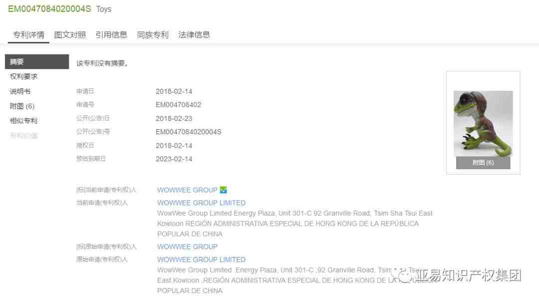 针对以上产品,我们一共检索到了三款欧盟外观专利,有做指尖恐龙的卖家请注意,需要从外观上跟专利产品有所区别,不要造成普通消费者的混淆。