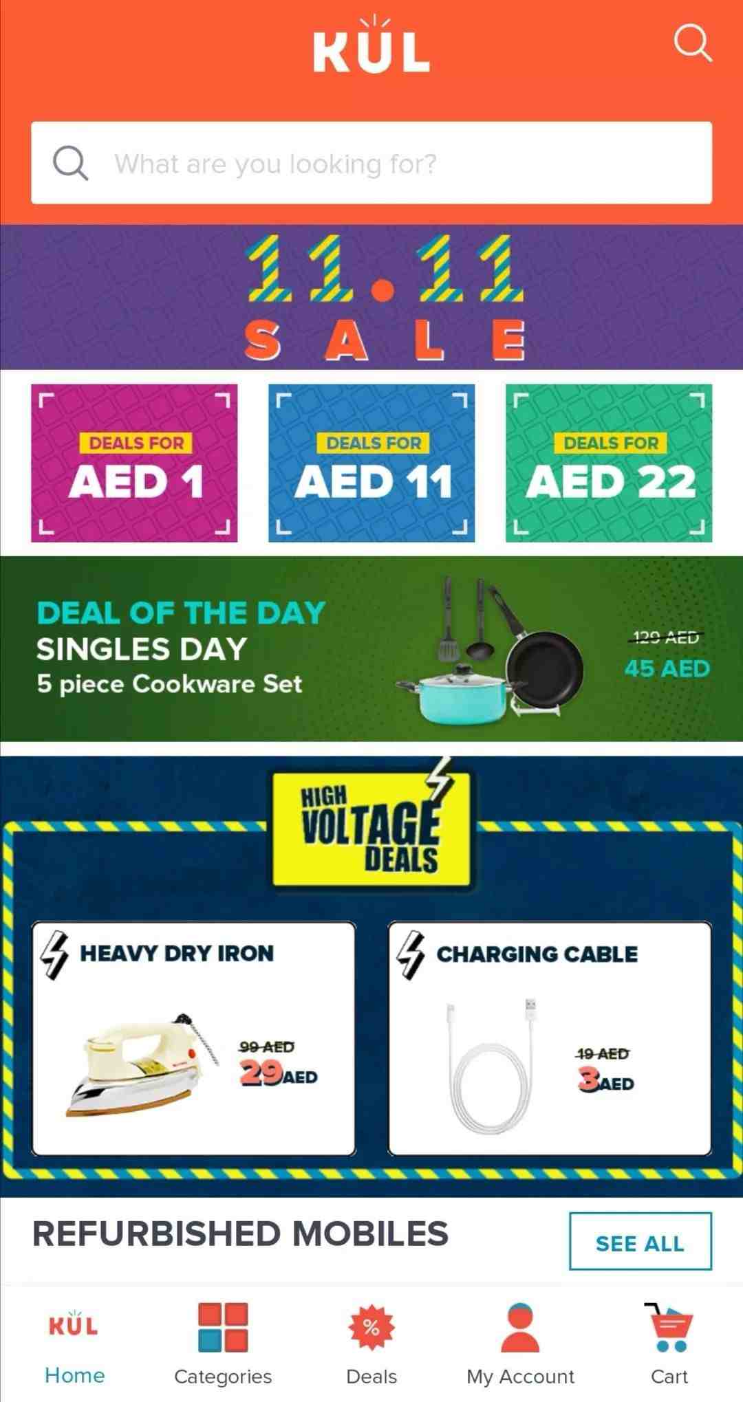 打开 KUL 新上线的APP,可以看到 KUL 也推出了 “11.11”的促销,还设置了1迪拉姆购、11迪拉姆购和22迪拉姆购专区。从分类来看,KUL 仍是全品类电商,主要以电子和家居日常用品为主。
