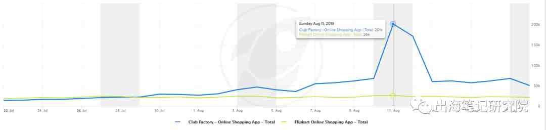 2019年7月底开始,Club Factory 的下载量远远高于印度本土电商巨头 Flipkart,特别是在8月11日高达20.1万下载量,达到顶峰。而8月11日也是3周年大促的最后一天。