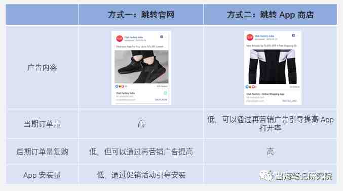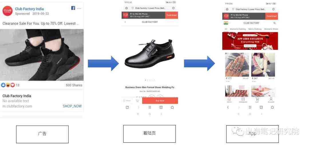 另一个有意思的发现是 Club Factory 的广告转化路径有两种,一种是直接跳转官网引导购买,第二种是跳转 App 商店引导安装。我们来分析一下在这两种策略下的用户转化路径,及其利弊。