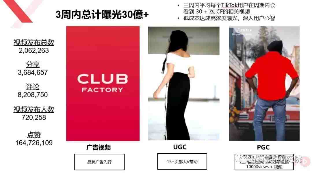 ③ TikTok 挑战赛将热度推向高潮:印度是个热爱歌舞的国度,并基于TikTok (抖音海外版) 在印度的庞大用户量(预估高达3亿),Club Factory 已敏锐地察觉到 KOL 红利要来了。Club Factory 邀请了30多个TikTok 网红推动自发的挑战活动,上线5天超20亿播放量,共72万余人参与视频制作,视频发布总数达到200万+支,最终活动触达次数高达70亿。